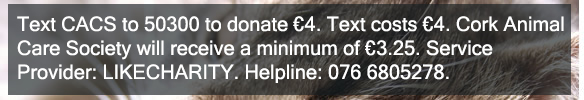 TEXT CACS to 50300 to donate €4. 100% of your donation goes to the Cork Animal Care Society across most network operators. Some operators apply VAT which means that a minimum of €3.25 will go to the Cork Animal Care Society. Service provider: LIKECHARITY. Helpline: 0766805278